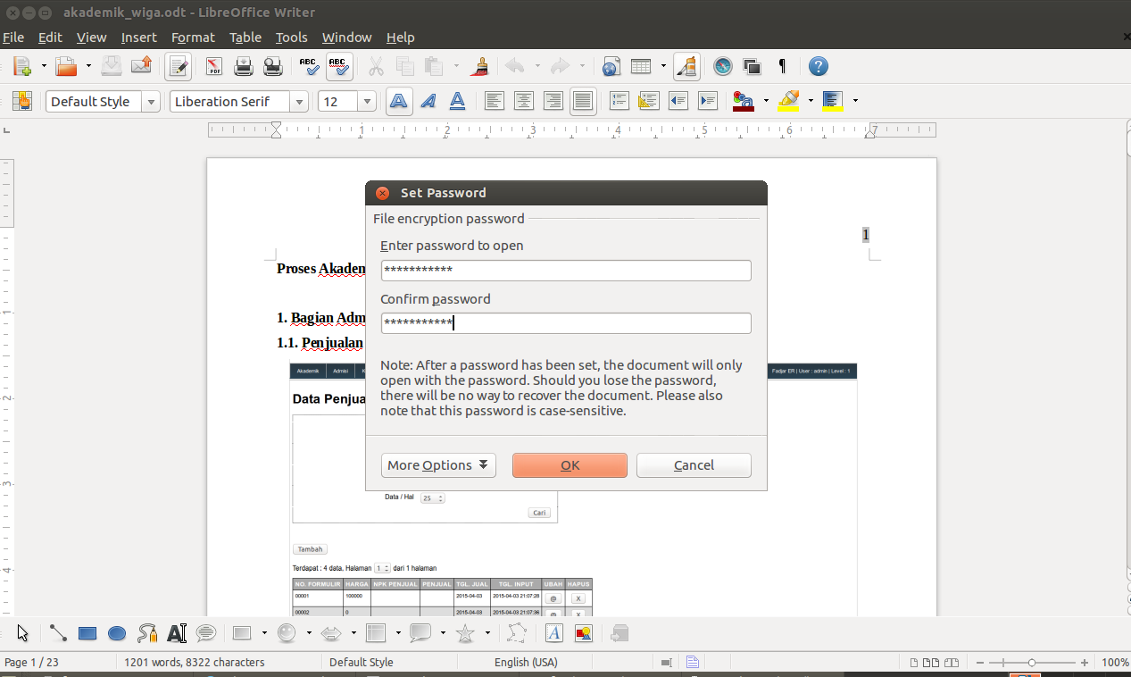 Ternyata memberi password pada dokumen kita yang berformat odt, sangat mudah sekali tanpa menginstall program pendukung lain.